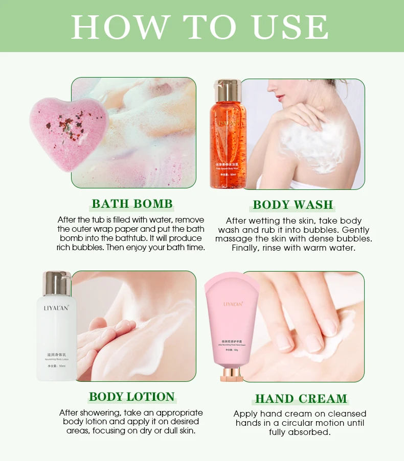 BODY WASH-After wetting the skin, take body wash and rub it into bubbles. Gently massage the skin with dense bubbles.Finally, rinse with warm water.